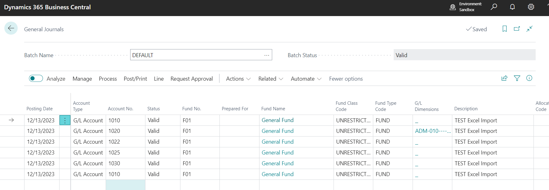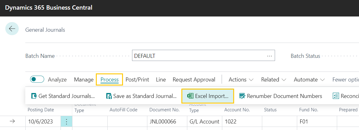 >> Open Business Central >> Go to General Journal page. Click on Process >> Excel Import.